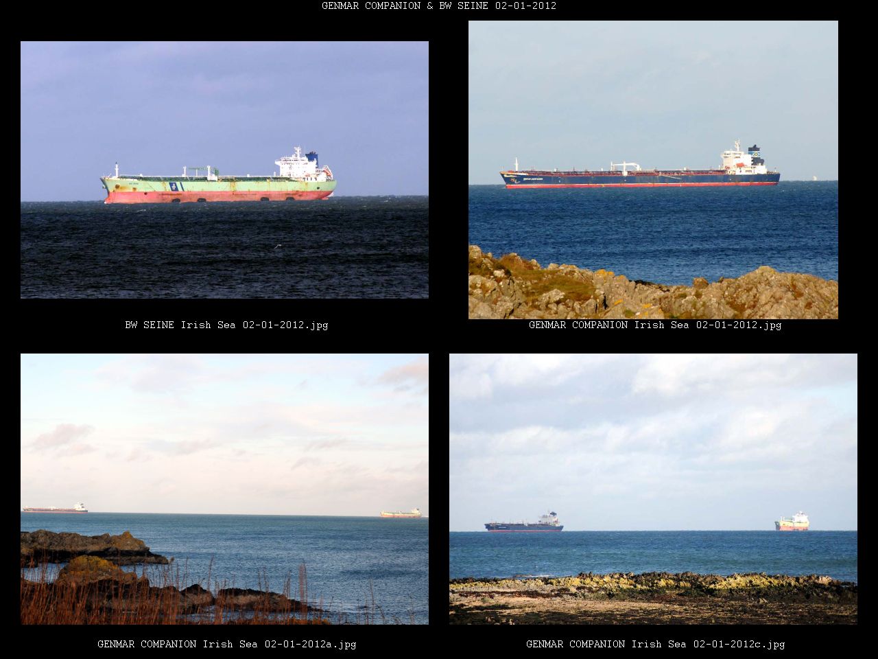 of the BW SEINE & GENMAR COMPANION at anchor off the Copeland Islands, at the mouth of Belfast Lough. The BW SEINE arrived at the Copeland Islands 01-01-2012 and dropped anchor. I don't know for sure if they have started discharging the Vaccum gas oil from the GENMAR COMPANION yet. Wilson {Information from Brendan Two weeks ago the Genmar Companion had been en route from Rotterdam to New York when the captain reported a suspected crack in the hull. The tanker, which is carrying a 54,000-tonne load of vacuum gas oil, was halted 25 miles off Tory Island (County Donegal) before rerouting to Belfast where repair work is to take place. The tanker was able to make its own way using its own power and is anchored off the Copeland Islands (mouth of Belfast Lough) in relatively sheltered waters. There is apparently no undue concern for the safety of the vessel or its cargo. The ship is currenly awaiting the arrival of another tanker to which it will offload its cargo before entering Belfast for repair.} Thank you Brendan for the information. |